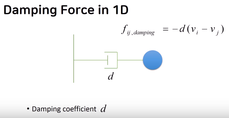 Damping Force in 1D :질점이 1개일때, 질점이 아닌 고정된 물체와 질점과의 속도 차이(상대속도)를 0으로 만드려는 힘
