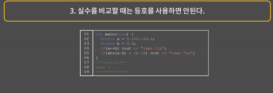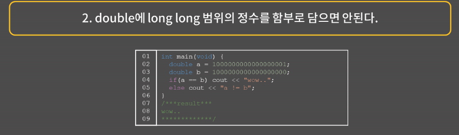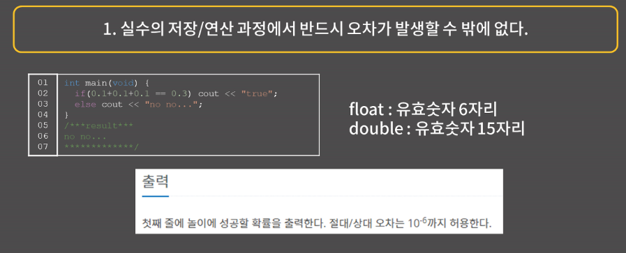 fraction field를 가지고 각 자료형이 어디까지 정확하게 표현할 수 있는지 보면 float은 유효숫자가 6자리[1-10^6 ~ 1+10^6]이고 double은 유효숫자가 15자리[1-10^15 ~ 1+10^15]입니다. 이 말은 곧 float은 상대 오차 10^-16까지 안전하고 double은 10^-15까지 안전하다.