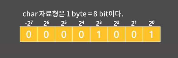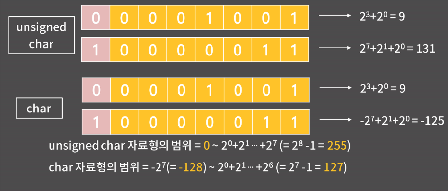 기본 char은 맨 앞이 부호를 결정하는 자리로써 -가 붙는다. 따라서 자료값(2진수) 계산시 계산 결과값이 다르다. 즉, 범위가 달라진다.