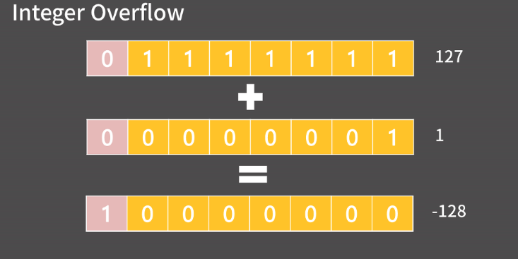 127에 1을 더하면 어떻게 될까? 컴퓨터는 아무 고민도 하지 않고 시킨대로 계산을 한게된다. 01111111에 1을 더하면 10000000이 된다.