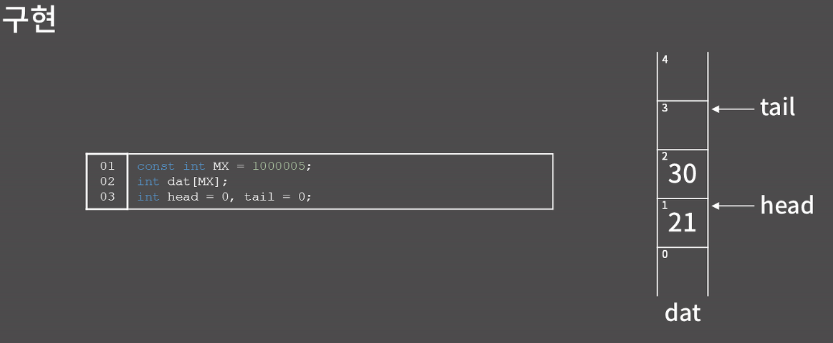 head는 가장 앞에있는 원소의 인덱스이고 tail은 가장 뒤에 있는 원소의 인덱스 +1 이다. 꼭 이렇게 안두고 tail을 가장 뒤에있는 원소의 인덱스로 두어도 괜찮다.
