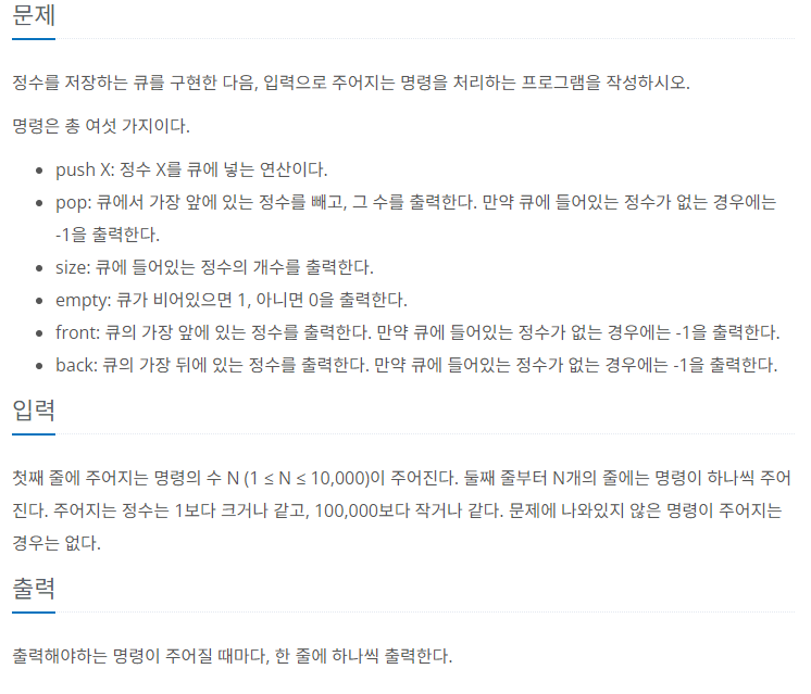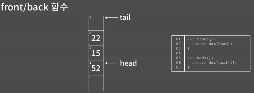 사실 원형 큐의 구현이라고 해봐야 head, tail이 MX가 될 경우 0으로 만드는 것만 달라지기 때문에 어려운 것은 아닌데, 그래도 여기서는 일단 원형 큐가 아니라 선형 배열에서의 큐를 다루겠다. push, pop은 각각 삽입과 삭제를 하는 함수이고 front, back은 각각 제일 앞쪽의 원소 확인과 제일 뒷쪽의 원소를 반환하는 함수이다.