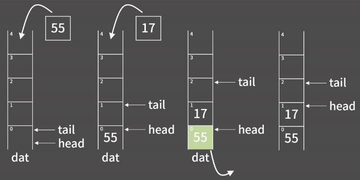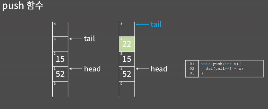 값을 추가하면 head는 변함이 없고 tail은 한 칸 올라가게 된다.
