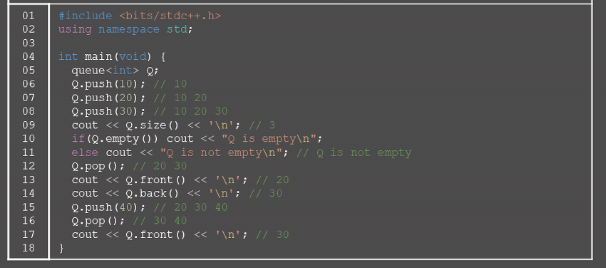물론 STL에 큐도 있다. 보통 큐는 BFS랑 Flood Fill를 할 때 쓰게 되는데 둘 다 코딩테스트 단골 문제여서 문제를 풀 때 STL queue를 쓸 일이 아주 아주 많을 것이다.