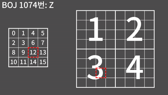 다음 레벨의 사각형을 4등분으로 구역을 나누고 1, 2, 3, 4 순으로 진행된다.