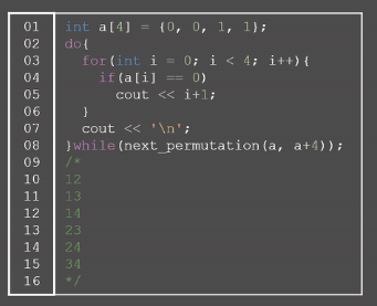 조합이 필요하다면 어떻게 해야할지 고민해보자. 예를 들어 1 2 3 4에서 수 2개를 순서 없이 뽑는 모든 경우를 출력하는 문제와 같은 상황이다. 그럴 때에도 이 함수를 이용하면 되는데 오른쪽의 코드를 확인해보겠다.