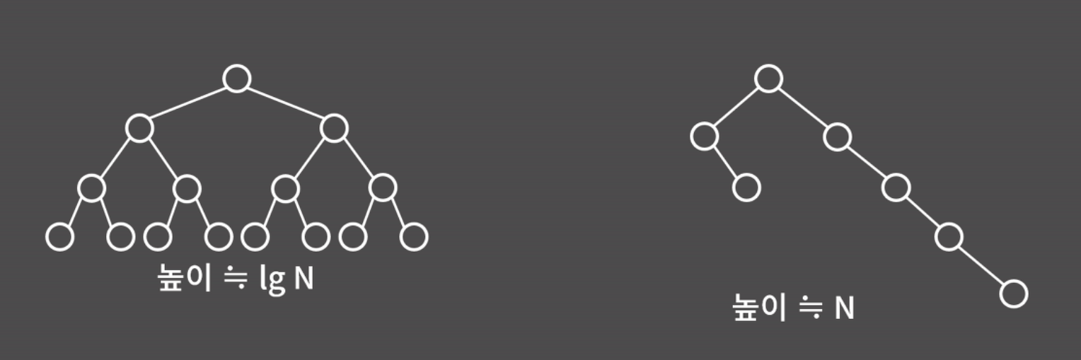 우리는 각 연산을 O(lg N)에 수행하려고 이진 검색 트리를 쓰는건데 만약 트리가 오른쪽 그림처럼 생기면 사실상 Linked List에서 삽입, 검색, 삭제를 한는 것과 별반 차이가 없게된다. 그리고 1,2,3,4, ... 이렇게 크기 순으로 주어진 원소를 삽입한다면 1이 루트이고 나머지 원소들이 오른쪽에 일직선으로 연결되는 편향된 트릐가 되니 이런 트리가 만들어지는 상황은 아주잘 발생할 수 있게된다.