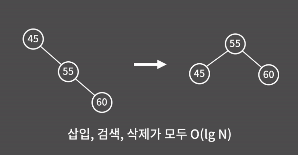 원리를 간단하게 설명하자면 위 왼쪽 그림처럼 뭔가 불균형이 발생했을 때 트리를 꺽어버린다. 이렇게 편향성을 해소해주는 자가 균형 트리를 사욜할 때 비로소 이진 검색 트리에서 삽입 검색, 삭제가 모두 O(lgN)이 된다.