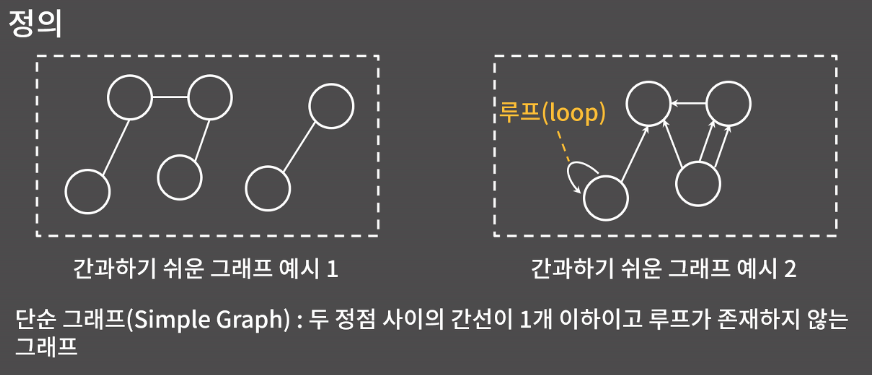 보통 문제에서는 필요에 따라 "그래프는 연결되어 있다/그래프는 연결그래프이다", "두 정점 사이의 간선은 최대 1개 존재한다/같은 간선은 한 번만 주어진다", "간선의 두 정점은 서로 다르다/간선은 서로 다른 두 정점을 연결한다"와 같이 조건을 엄밀하게 지정하는 경우가 많다. 그러나 이러 추가적인 조건이 주어지지 않았다면 그림에 있는 그래프처럼 그래프가 분리되어 있거나, 같은 간선이 여러 개 있거나, 혹은 루프가 있거나 하는 형태에 대해서도 올바른 답을 낼 수 있게 코드를 짜야한다는걸 기억해야 한다. 참고로 두 정점 사이의 간선이 1개 이하이고 루프가 존재하지 않는 그래프를 우리는 단순 그래프(Simple Graph)라고 한다.