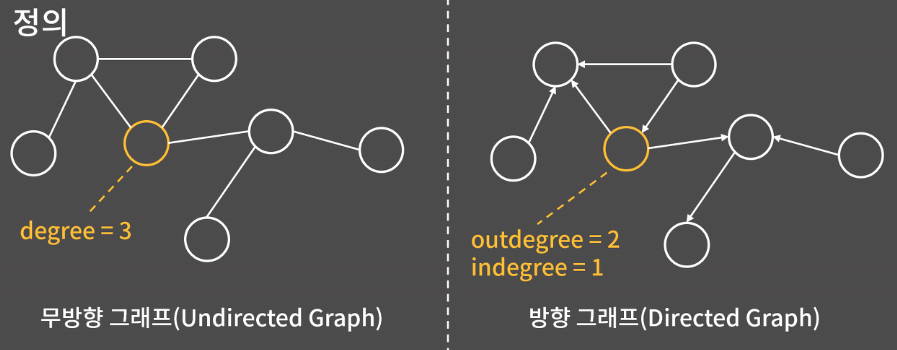 방향 그래프에서도 차수라는 개념이 있는데 자기에게서 나가는 간선의 개수는 outdegree(차출 차수)이고 들어오는 개수는 indegree(진입 차수)이다.