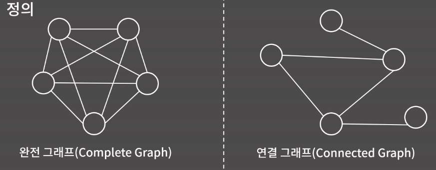 또한 모든 서로 다른 정점이 쌍이 간선으로 연결된 그래프를 완전 그래프(Complete Graph)라고 부른다. 그리고 임의의 두 정점 사이에 경로가 항상 존재하는 그래프는 연결 그래프(Connected Graph)라고 부른다.