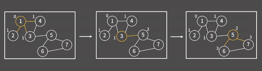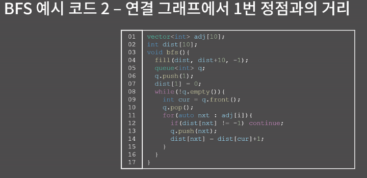 BFS 단원에서 응용을 소개할 때 다룬 내용이지만 그래프에서도 시작점에서 다른 모든 점으로의 최단 경로를 찾을 때 BFS를 이용할 수 있다. BFS의 과정 중에서 현재 보는 정점으로부터 추가되는 인접한 정점은 시작점으로부터 1만큼 더 떨어져 있다. 즉 모든 간선의 길이가 동일한 상황에서 두 지점 사이의 거리를 찾는 문제는 BFS로 해결이 가능하다. 하지만 만약 모든 간선의 길이가 다르다면 이 문제는 플로이드나 다익스트라와 같은 다른 알고리즘을 사용해야된다.