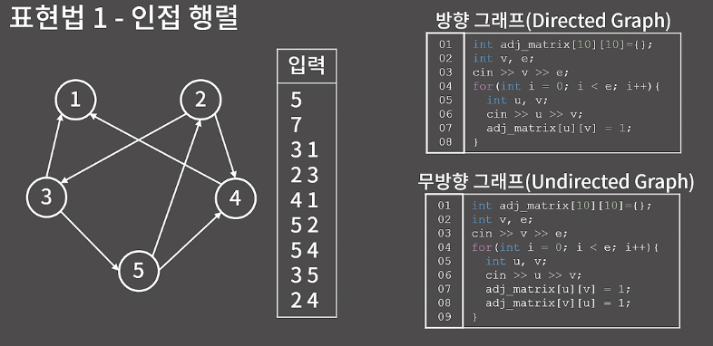 먼저 방향 그래프의 예시를 보면 adj_matrix 배열을 선언한 후에 간선을 입력 받으면서 adj_matrix[u][v] = 1로 만들면 끝이다. 만약 이게 무방향 그래프였다면 adj_matrix[u][v]와 adj_matrix[v][u]를 모두 1로 만들면 된다. 여기까지가 행렬을 이용하는 방법이다.