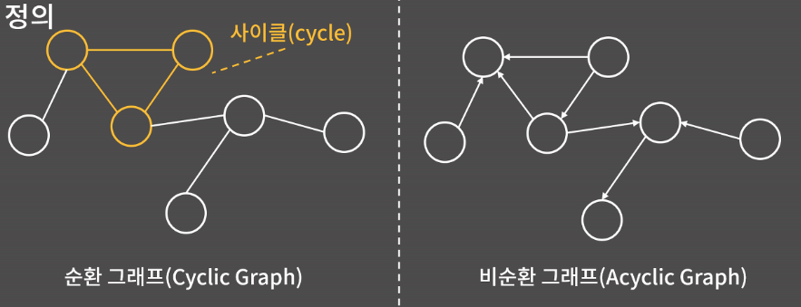 사이클이란 임의의 한 점에서 출발해 자기 자신으로 돌아올 수 있는 경로를 말한다. 그래프 안에 사이클이 하나라도 있으면 순환 그래프(Cyclic graph)라고 하고 사이클이 하나도 없으면 비순환 그래프(Acyclic graph)라고 한다. 그래프가 방향 그래프인지 무방향 그래프인지 무관하게 동일하다. 오른쪽의 경우에는 얼핏 보면 왼쪽처럼 사이클이 있는 것처럼 보이지만 간선의 방향성으로 인해 사이클이 없다는 거에 유의하자.
