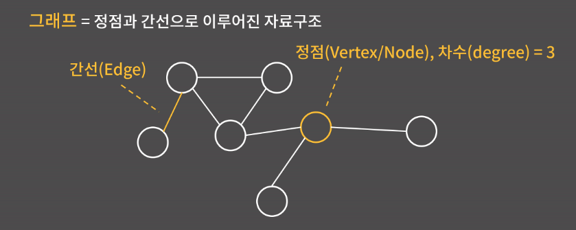 그래프란 정점과 간선으로 이루어진 자료구조를 말한다. 차수는 각 정점에 대해서 간선으로 연결된 이웃한 정점의 개수이다. 그래프는 네비게이션에서 최단 경로 찾기, 혹은 구글 같은 검색엔진에서 랭킹 정하기와 같이 뭔가 원소 사이의 연결 관계를 설정해야 하는 상황에서 유용하게 활용될 수 있는 자료구조이다.
