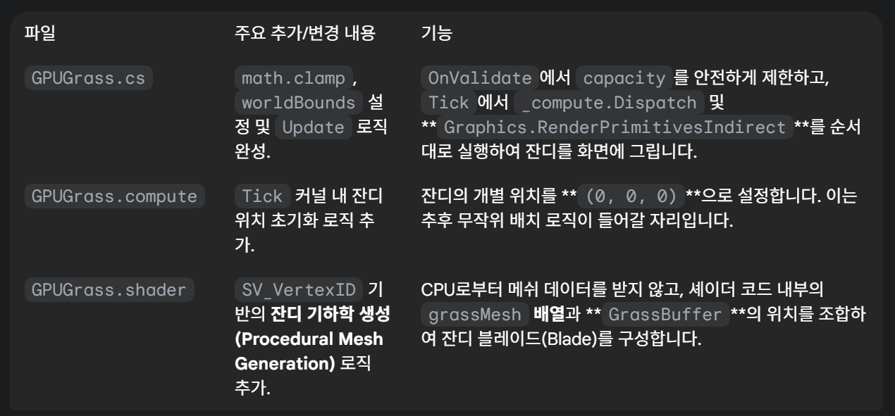- _compute.Dispatch: Tick 커널을 실행하여 잔디의 위치(GrassBuffer)를 업데이트합니다.